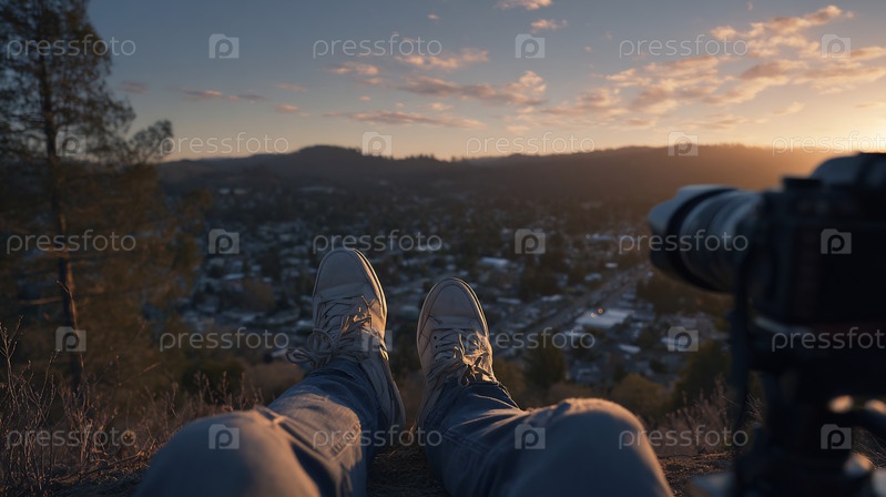 Фото ног, камер и города в сумерках