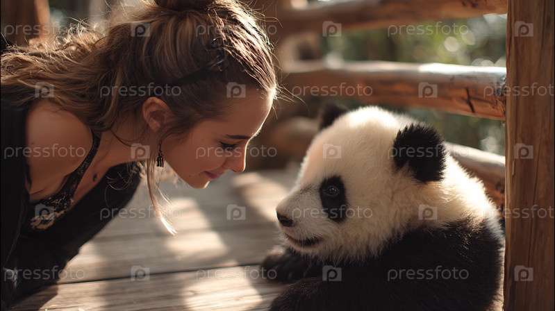 Молодая женщина тесно взаимодействует с очаровательной маленькой пандой, делясь нежным моментом