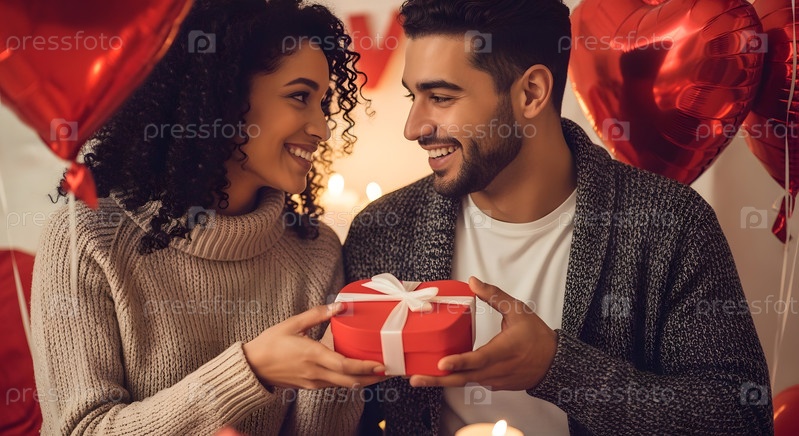 Мужчина дарит женщине красную подарочную коробку с белой лентой в День святого Валентина