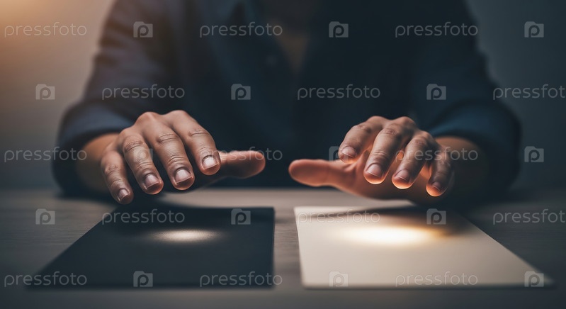 Человеческие руки плавают над двумя светящимися поверхностями, символизируя выбор или взаимодействие