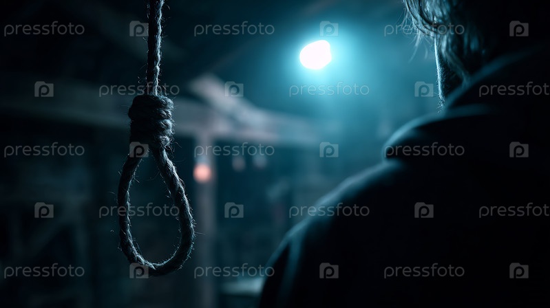 Суровая сцена с мужчиной, стоящим перед висящей веревкой в слабо освещенном пространстве