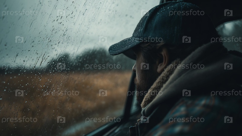Человек в шляпе смотрит через окно машины в дождливый день