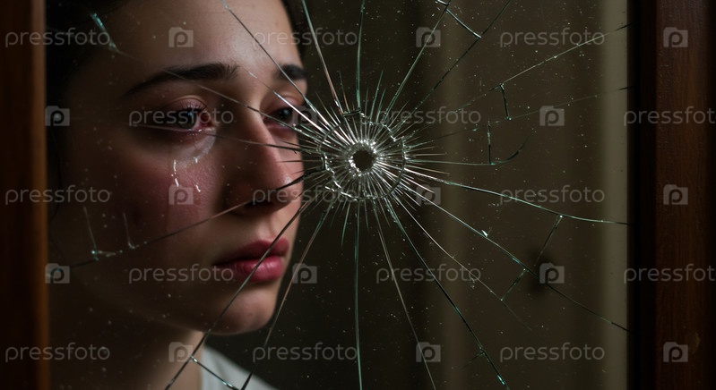 Ближайший снимок молодой женщины, плачущей через разбитое стекло. Её лицо показывает глубокую печаль и эмоциональную боль