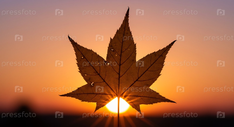 Красивый осенний лист на ярком закате солнца.Теплые цвета