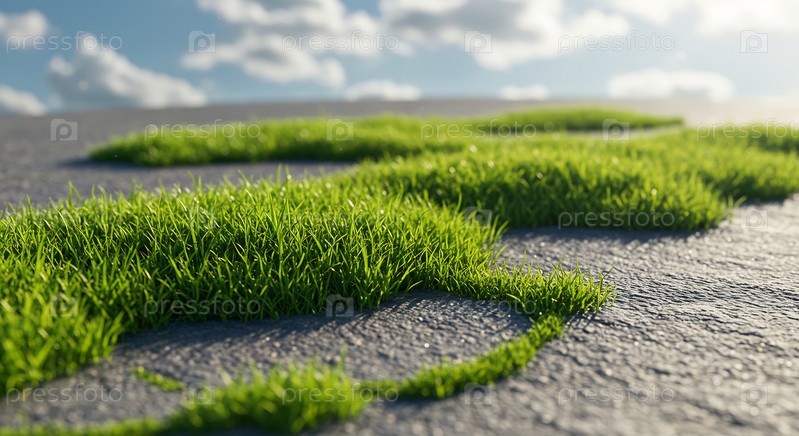 Плодородная зеленая трава растет сквозь трещины на серой бетонной тротуаре под ясным небом