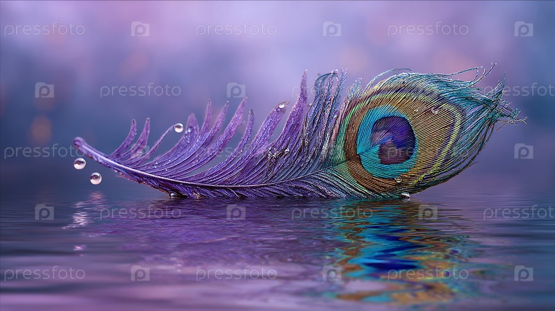 Яркое павлинное перо на воде с отражениями и каплями