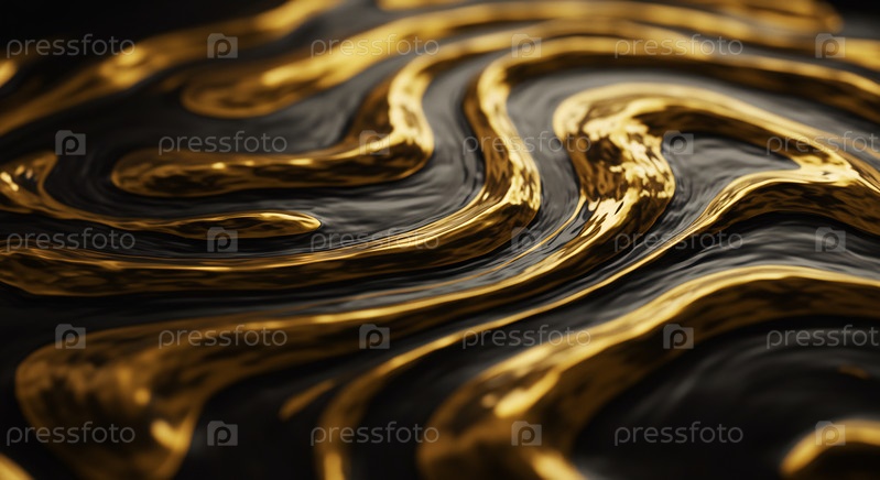 Закрытие золотой жидкости, протекающей по темной текстурированной поверхности. абстрактный роскошный фон