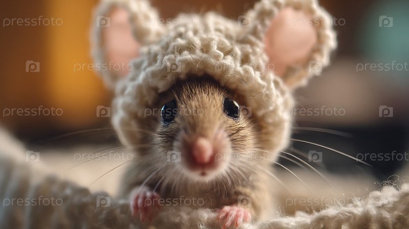 Близкий план очаровательной маленькой мыши в милой, уютной вязанной шляпе