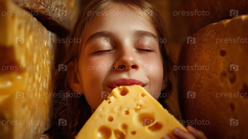 Счастливая молодая девушка закрывает глаза, наслаждаясь большим куском вкусного сыра
