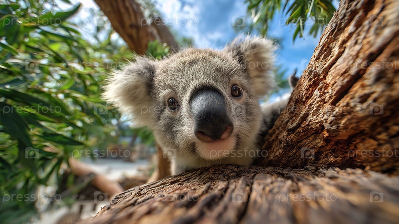 Портрет очаровательной коалы, которая любопытно смотрит на дерево
