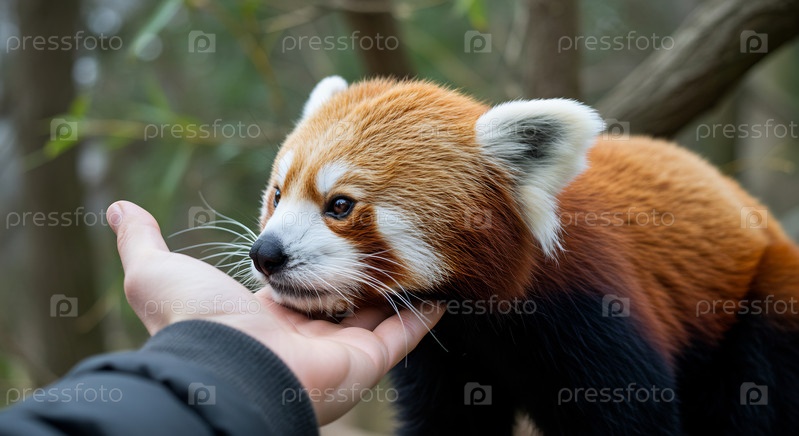 Близкий план красной панды, которую ласкает человеческая рука в природе