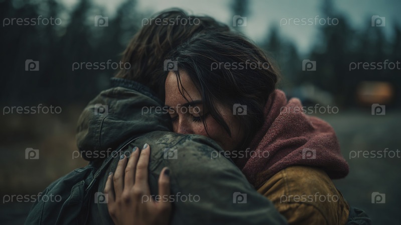 Близкий план глубокого эмоционального объятия между двумя людьми на открытом воздухе