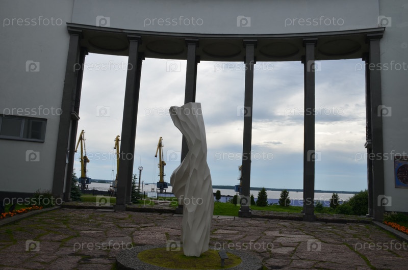 Двор выставочного центра Эрмитаж-Выборг (здания в стиле функционализма, архитектор Уно Улберг), монументальная скульптура 'Стремящийся' (скульптор Виктор Грачев) за колоннадой вид на краны Выборгского порта на вершине