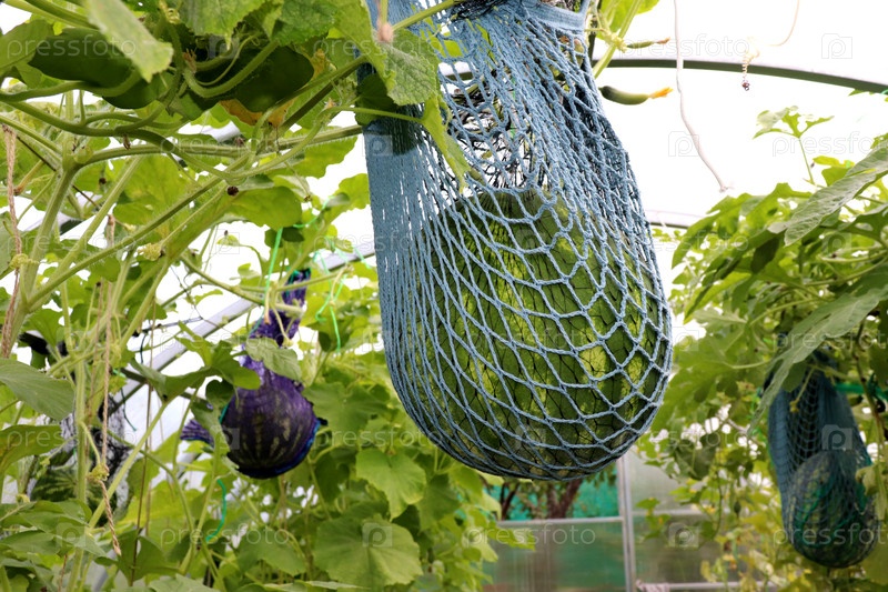 Удлиненный большой плод арбуза в опорной сетке на фоне других арбузов созревает в теплице на вертикальной дыни