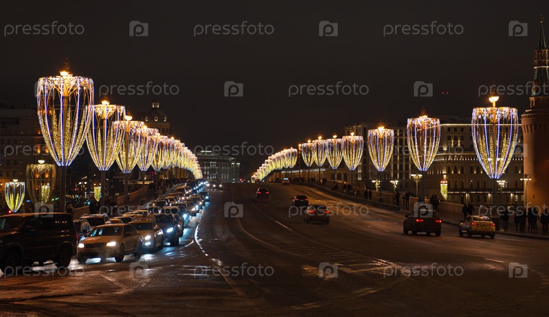 Москва.Россия.21 декабря 2020.Праздничный вид светящихся открытых новогодних фонарей на Большом мосту под Красной площадью