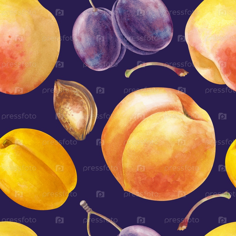 Акварельный бесшовный фруктовый рисунок на темно-синем фоне, нарисованный вручную. Персики, абрикосы, сливы с ямами и ветвями. Ботанический бесшовный фон с сочными сезонными плодами. Для упаковки, обоев, кухонных текстилей