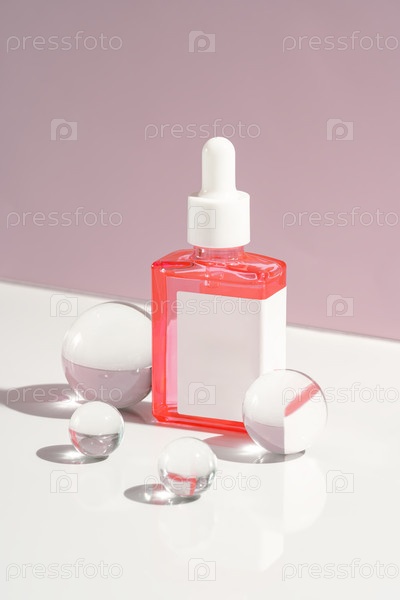 Квадратная бутылка сыворотки с эфирными маслами, показанная на спокойном розовом цвете среди стеклянных шариков.Концепция естественного ухода за кожей для увлажняющих, омолаживающих и чистых кампаний по красоте