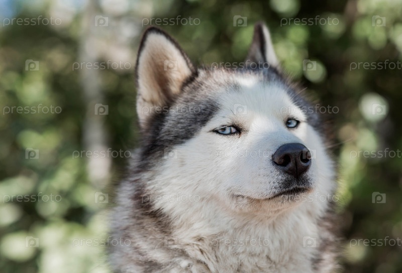 Близкий план головы гуски с голубыми глазами на размытом фоне. Кожа собаки серовато-белая. Собака смотрит прямо в камеру