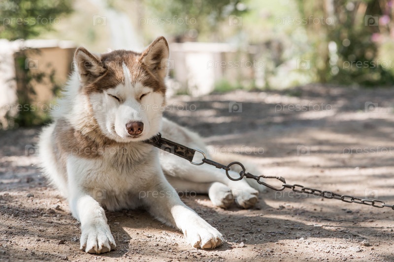 Снимок хаски на цепи с размытым фоном.Шерсть собаки серо-коричневая