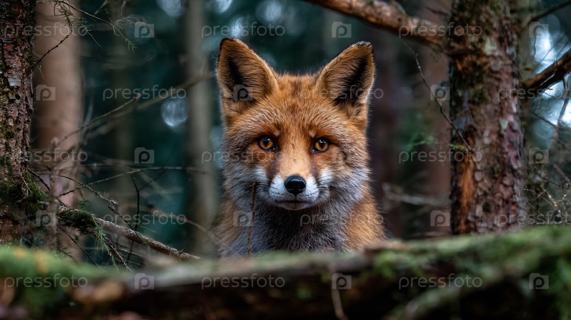 Красивая красная лиса с яркими глазами пристально смотрит из лесного заросля