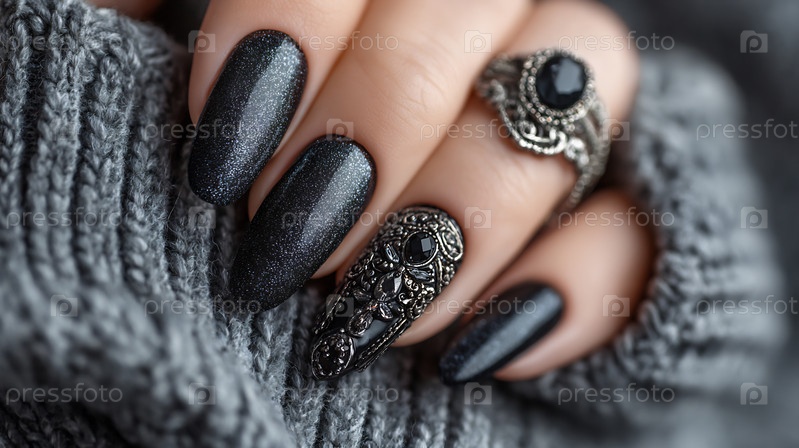 Стильная рука с темно-блестящими ногтями и орнаментированными кольцами, на сером свитере