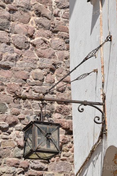 Кованый старый фонарь на стене средневековой крепости на замке острова Выборг в Ленинградской области