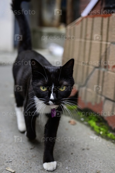 Черно-белый кот с зелеными глазами на улице