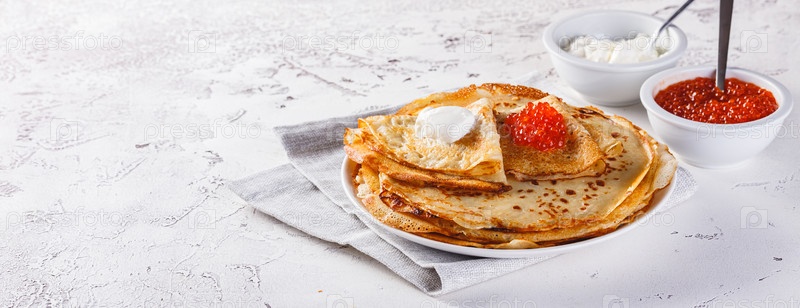 Стол российских блинов с красной икры, свежей кислой смесью