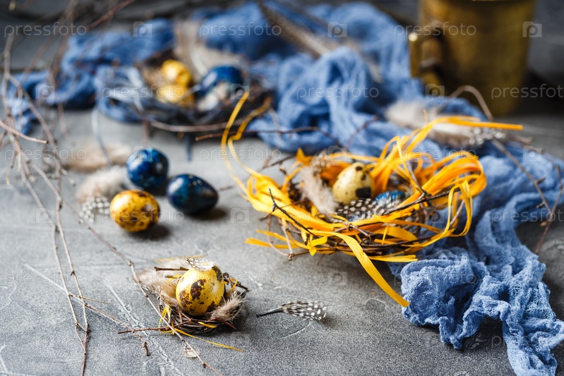Перепелиные пасхальные яйца с перьями в гнезде на коричневом столе с копирайтером