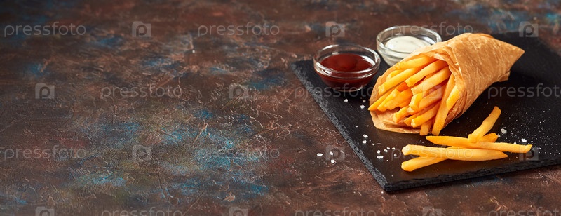 Вкусные картофель фри на режущей доске, на фоне деревянного стола