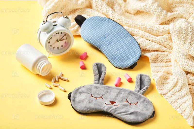 Маска для сна, будильник, затычки для ушей и желтые таблетки.Концепция здорового ночного сна