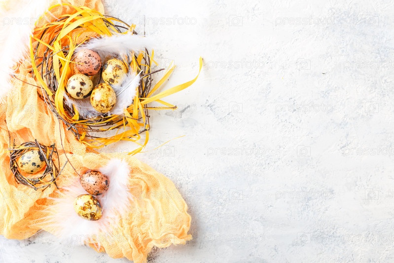 Пасхальные яйца с перьями в гнезде на белом столе со копирайтером