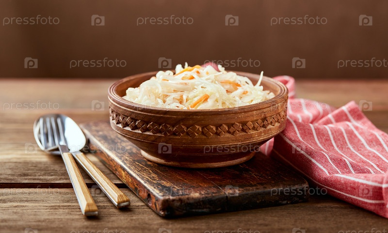 Соровая капуста, ферментированная с морковью в миске на деревянном фоне со копирующим пространством