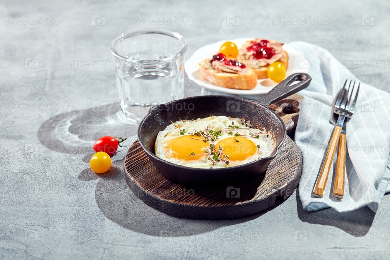 Жареные яйца в чугунных сковородках. солнечный утренний завтрак