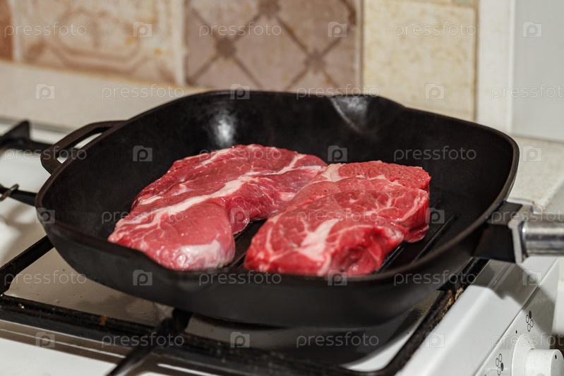 Два свежих сырых Prime Black Angus Chuck говяжьих стейка, жареных в сковороде на газовой плите