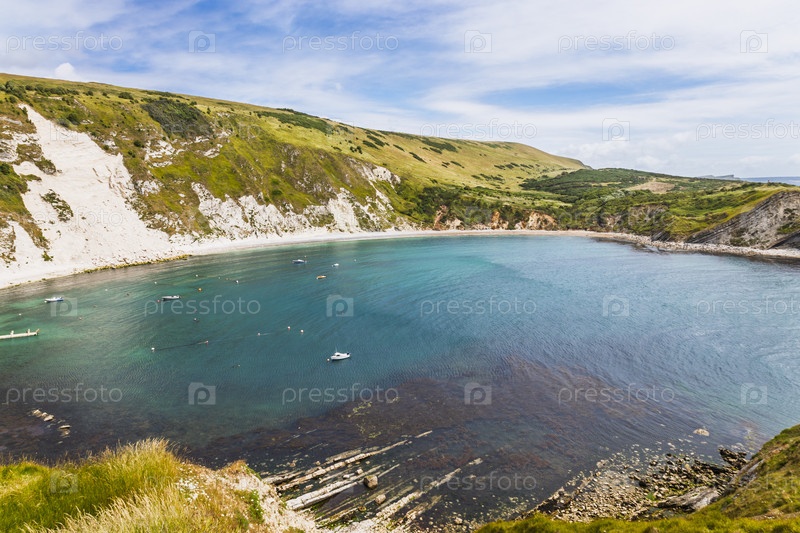 Плавучая панорама залива Лулворт, Дорсет - бирюзовая вода, якорные лодки, известняковые скалы и зеленые холмы на юрском побережье Англии