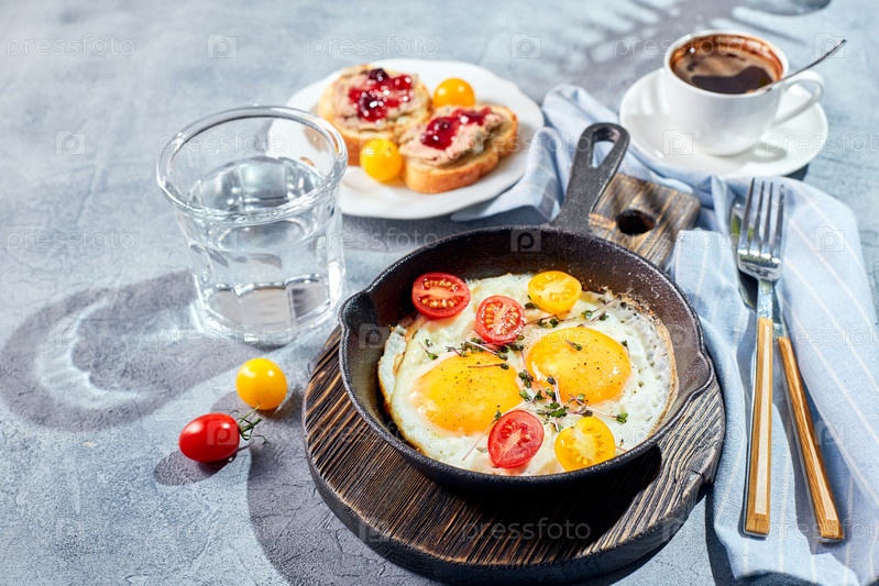 Жареные яйца в чугунных сковородках. солнечный утренний завтрак