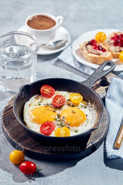 Жареные яйца. жареное яйцо из двух яиц в чугунной сковороде с вишневыми помидорами и микрозеленками, тост и чашка кофе. солнечный утренний завтрак