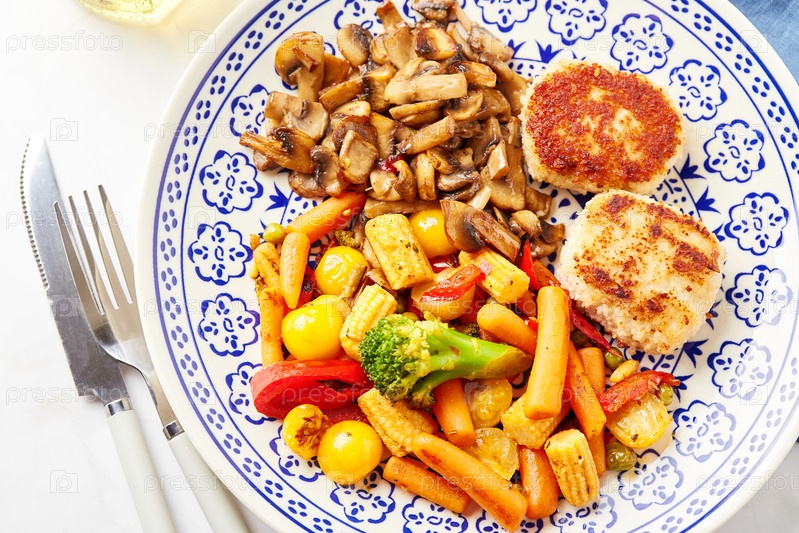 Тарелка жареных овощей, морковь, брокколи, кукуруза для детей, перцовый перец, жареное шампанское и два куриных шарика