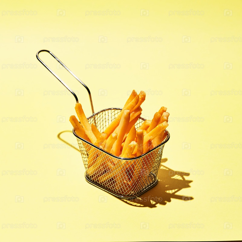 Вкусные картофель фри в металлической корзине из проволоки на жёлтом столе под солнцем