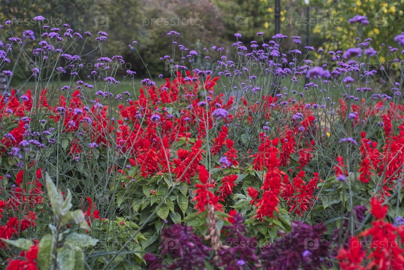 Красные цветы сальвии в осеннем саду