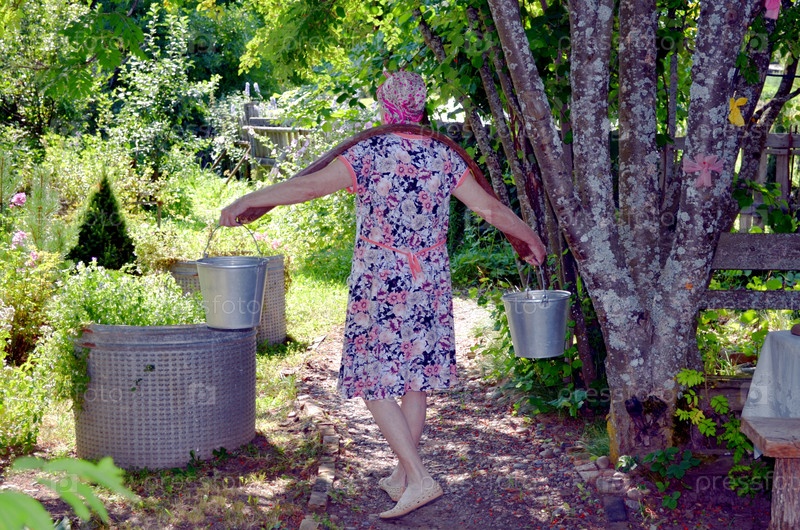 Пожилая женщина несет ведра на ведро