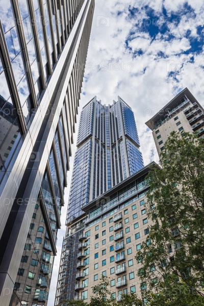 Драматический вид на город с низким углом отражения стеклянных башен, обрамленных деревьями и облаками