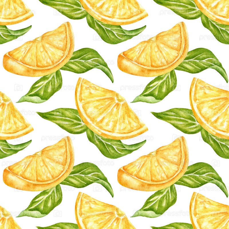 Лимонные ломтики и сочные зеленые листья, акварель с бесшовным узором