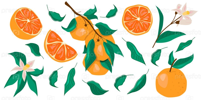 Набор апельсинов и оранжевых листьев