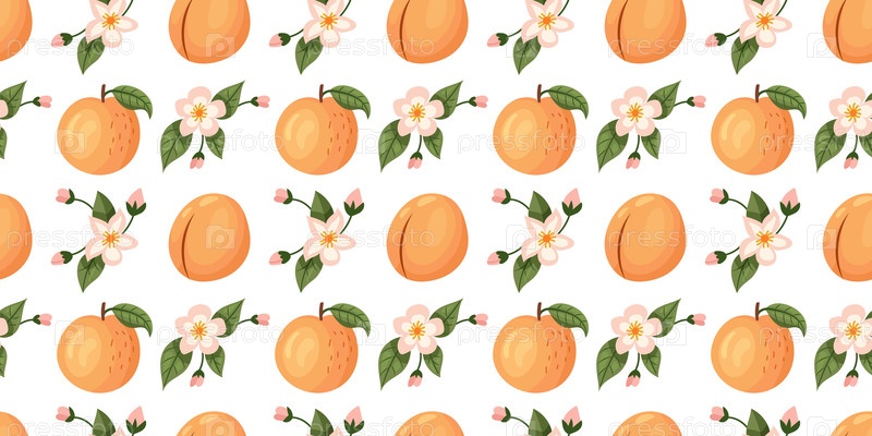 Красивый бесшовный рисунок с целыми персиками, цветами и листьями на белом фоне в ярком стиле