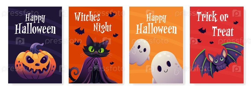 Плакаты Хэллоуина с котом, призраками, тыквой и летучими мышами