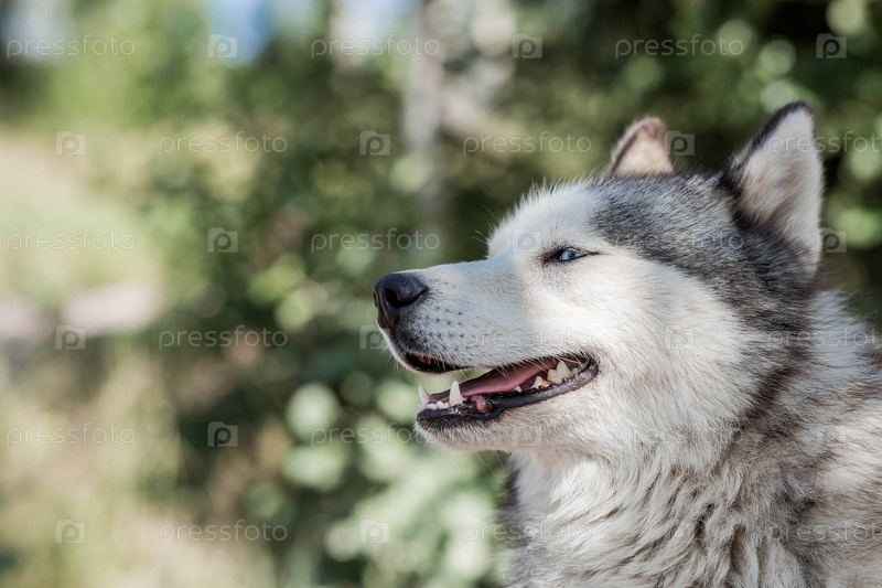 Близкий план головы гуски с голубыми глазами на размытом фоне. Кожа собаки серовато-белая. Собака смотрит прямо в камеру