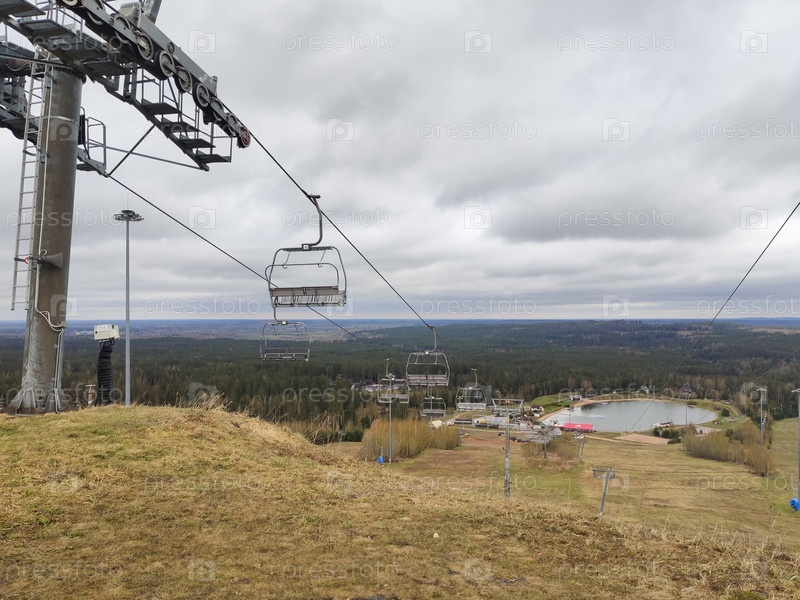 Горнолыжный лифт на вершине холма, горнолыжный курорт в России, Ленинградская область, весна 2024