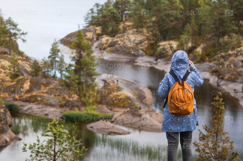 Туризм. пешком. Ладожские скалы на Ладожском озере. Турист в плаще с рюкзаком на каменистых островах смотрит издалека. Республика Карелия, Россия
